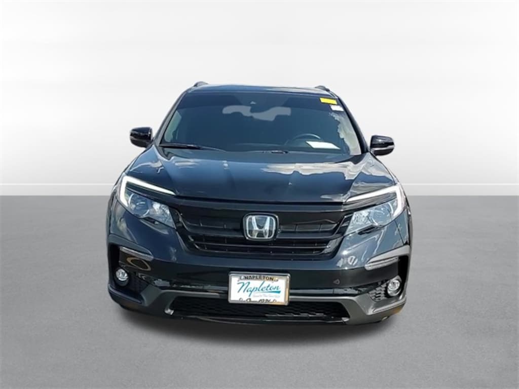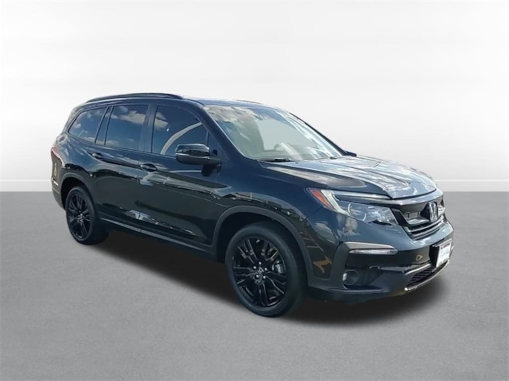 This Pilot is well equipped with 3rd row seats: split-bench, 4-Wheel Disc Brakes, 4.33 Axle Ratio, 7 Speakers, A/V remote: CabinControl, ABS brakes, Air Conditioning, Alloy wheels, AM/FM radio: SiriusXM, Apple CarPlay/Android Auto, Auto High-beam Headlights, Automatic temperature control, Blind Spot Information (BSI) System warning, Brake assist, Bumpers: body-color, Cloth Seat Trim, Delay-off headlights, Driver door bin, Driver vanity mirror, Dual front impact airbags, Dual front side impact airbags, Electronic Stability Control, Emergency communication system: HondaLink Assist, Exterior Parking Camera Rear, Forward collision: Collision Mitigation Braking System (CMBS) + FCW mitigation, Four wheel independent suspension, Front anti-roll bar, Front Bucket Seats, Front Center Armrest, Front dual zone A/C, Front fog lights, Front reading lights, Fully automatic headlights, Heated door mirrors, Heated Front Bucket Seats, Heated front seats, Illuminated entry, Lane departure: Lane Keeping Assist System (LKAS) active, Low tire pressure warning, Occupant sensing airbag, Outside temperature display, Overhead airbag, Overhead console, Panic alarm, Passenger door bin, Passenger vanity mirror, Power door mirrors, Power driver seat, Power steering, Power windows, Radio data system, Radio: 215-Watt Audio System, Rear air conditioning, Rear anti-roll bar, Rear reading lights, Rear seat center armrest, Rear window defroster, Rear window wiper, Reclining 3rd row seat, Remote keyless entry, Roof rack: rails only, Security system, Speed control, Speed-sensing steering, Speed-Sensitive Wipers, Split folding rear seat, Spoiler, Steering wheel mounted audio controls, Tachometer, Telescoping steering wheel, Tilt steering wheel, Traction control, Trip computer, Turn signal indicator mirrors, Variably intermittent wipers, and Wheels: 20" Pewter Gray Alloy.