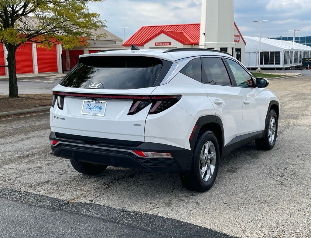 This Tucson is well equipped with Option Group 01, AWD, 3.648 Axle Ratio, 4-Wheel Disc Brakes, 6 Speakers, ABS brakes, Air Conditioning, Alloy wheels, AM/FM radio: SiriusXM, Apple CarPlay & Android Auto, Auto High-beam Headlights, Brake assist, Bumpers: body-color, Cargo Net, Carpeted Floor Mats, Delay-off headlights, Driver door bin, Driver vanity mirror, Dual front impact airbags, Dual front side impact airbags, Electronic Stability Control, Emergency communication system: Blue Link Connected Car Service (3-year complimentary subscription), First Aid Kit, Four wheel independent suspension, Front and Rear Mudguards, Front anti-roll bar, Front Bucket Seats, Front Center Armrest, Front reading lights, Fully automatic headlights, H-Tex Seat Trim, Heated door mirrors, Heated Front Bucket Seats, Heated front seats, Illuminated entry, Low tire pressure warning, Occupant sensing airbag, Outside temperature display, Overhead airbag, Overhead console, Panic alarm, Passenger door bin, Passenger vanity mirror, Power door mirrors, Power driver seat, Power Liftgate, Power steering, Power windows, Radio data system, Radio: AM/FM/HD/SiriusXM Audio System, Rear anti-roll bar, Rear Bumper Applique, Rear seat center armrest, Rear window defroster, Rear window wiper, Remote keyless entry, Roof rack: rails only, Security system, Speed control, Split folding rear seat, Spoiler, Stain & Odor Resistant Cloth Seat Trim, Steering wheel mounted audio controls, Tachometer, Telescoping steering wheel, Tilt steering wheel, Traction control, Trip computer, Turn signal indicator mirrors, Variably intermittent wipers, Wheel Locks, and Wheels: 17" x 7.0J" Alloy.