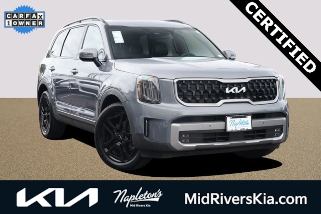 This Telluride is well equipped with Kia Certified Pre-Owned Certified, 10 Speakers, 3.648 Axle Ratio, 3rd row seats: split-bench, 4-Wheel Disc Brakes, ABS brakes, Air Conditioning, Alloy wheels, AM/FM radio: SiriusXM, Apple CarPlay & Android Auto, Auto High-beam Headlights, Auto-dimming Rear-View mirror, Auto-leveling suspension, Automatic temperature control, Brake assist, Bumpers: body-color, Carpet Floor Mats, Compass, Delay-off headlights, Driver door bin, Driver vanity mirror, Dual front impact airbags, Dual front side impact airbags, Electronic Stability Control, Emergency communication system: 911 Connect, Exterior Parking Camera Rear, Four wheel independent suspension, Front anti-roll bar, Front Bucket Seats, Front Center Armrest, Front dual zone A/C, Front fog lights, Front reading lights, Fully automatic headlights, Garage door transmitter: HomeLink, harman/kardon® Speakers, Heated & Ventilated Front Bucket Seats, Heated door mirrors, Heated front seats, Heated steering wheel, Illuminated entry, Knee airbag, Leather Seat Trim, Leather Shift Knob, Leather steering wheel, Low tire pressure warning, Memory seat, Navigation System, Occupant sensing airbag, Outside temperature display, Overhead airbag, Overhead console, Panic alarm, Passenger door bin, Passenger vanity mirror, Power door mirrors, Power driver seat, Power Liftgate, Power moonroof, Power passenger seat, Power steering, Power windows, Radio data system, Radio: AM/FM harman/kardon Audio System, Rear air conditioning, Rear anti-roll bar, Rear audio controls, Rear reading lights, Rear side impact airbag, Rear window defroster, Rear window wiper, Reclining 3rd row seat, Remote keyless entry, Roof rack: rails only, Security system, Smart Key w/ Push Button and Remote Start, Speed control, Speed-sensing steering, Split folding rear seat, Spoiler, Steering wheel mounted audio controls, Tachometer, Telescoping steering wheel, Tilt steering wheel, Traction control, Trip computer, Turn signal indicator mirrors, Variably intermittent wipers, Ventilated front seats, and Wheels: 20" x 7.5" Black Finish X-LINE Exclusive.