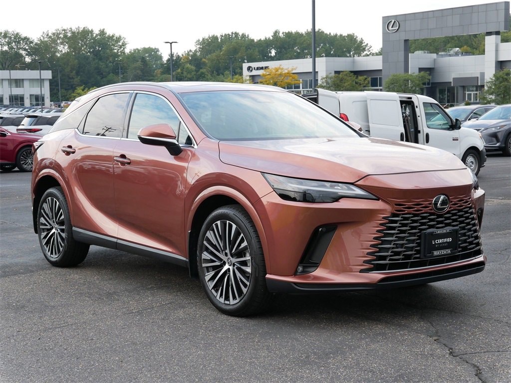This RX is well equipped with L/Certified Certified, AWD, Black w/Black Open Pore w/NuLuxe Seat Trim, ABS brakes, Active Cruise Control, Alloy wheels, Compass, Electronic Stability Control, Front dual zone A/C, Heated & Ventilated Front Bucket Seats, Heated door mirrors, Heated front seats, Illuminated entry, Leather Seat Trim, Low tire pressure warning, Power Liftgate, Power moonroof, Remote keyless entry, Traction control, 12 Speakers, 19 Wheels, 3.33 Axle Ratio, 4-Wheel Disc Brakes, 8-Way Power Driver & Front Passenger Seat Adjusters, Air Conditioning, AM/FM radio: SiriusXM, Anti-whiplash front head restraints, Auto High-beam Headlights, Auto tilt-away steering wheel, Auto-dimming door mirrors, Auto-dimming Rear-View mirror, Automatic temperature control, Brake assist, Bumpers: body-color, Delay-off headlights, Driver door bin, Driver vanity mirror, Dual front impact airbags, Dual front side impact airbags, Emergency communication system: Safety Connect (10-year trial), Exterior Parking Camera Rear, Finish Plate Door Inner Garnish, Four wheel independent suspension, Front anti-roll bar, Front Bucket Seats, Front Center Armrest, Front fog lights, Front reading lights, Fully automatic headlights, Garage door transmitter: HomeLink, Genuine wood console insert, Heated steering wheel, Leather Shift Knob, Leather steering wheel, Memory seat, Multi-Color Illuminated Entry System, Occupant sensing airbag, Outside temperature display, Overhead airbag, Overhead console, Panic alarm, Parking Support Alert/Brake, Passenger door bin, Passenger vanity mirror, Power door mirrors, Power driver seat, Power passenger seat, Power steering, Power windows, Radio data system, Radio: Lexus Interface w/14 HD Touchscreen Display, Rain sensing wipers, Rear air conditioning, Rear anti-roll bar, Rear reading lights, Rear seat center armrest, Rear side impact airbag, Rear window defroster, Rear window wiper, Security system, Speed control, Speed-sensing steering, Split folding rear seat, Spoiler, Steering wheel memory, Steering wheel mounted audio controls, Tachometer, Telescoping steering wheel, Tilt steering wheel, Trip computer, Turn signal indicator mirrors, Variably intermittent wipers, Ventilated front seats, Wireless Apple CarPlay/Wireless Android Auto, Wireless Charger, and Wood Steering Wheel w/Paddle & Heater.