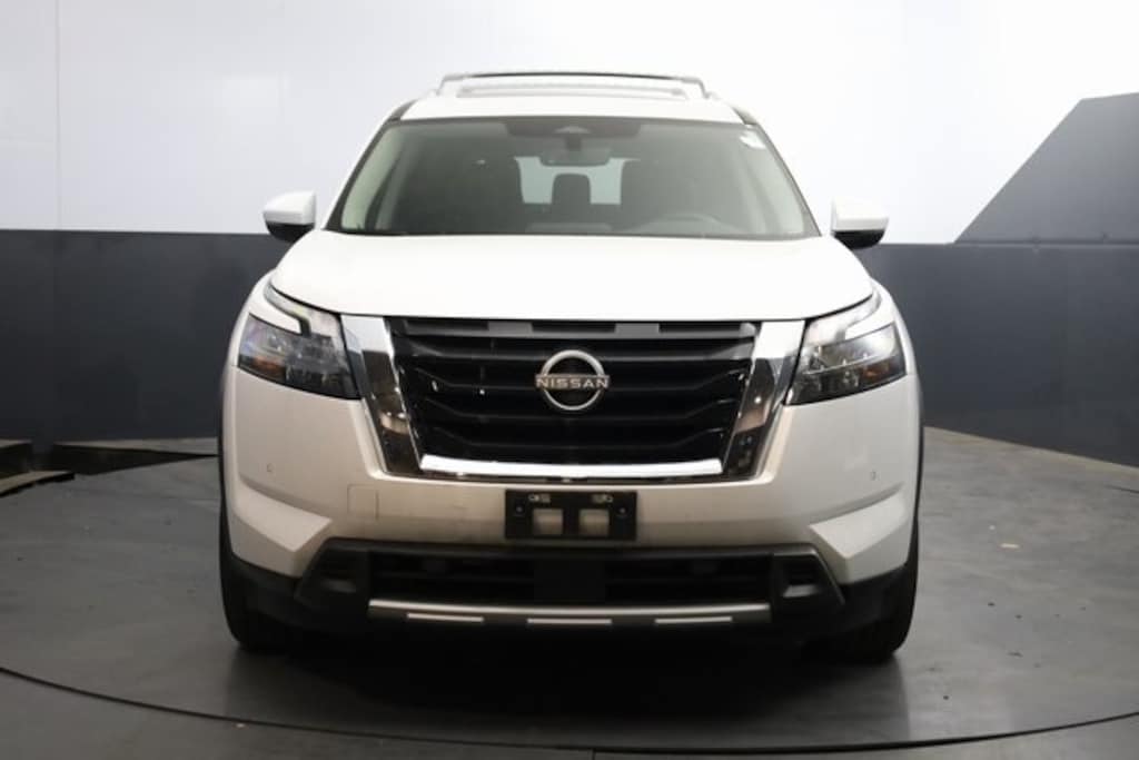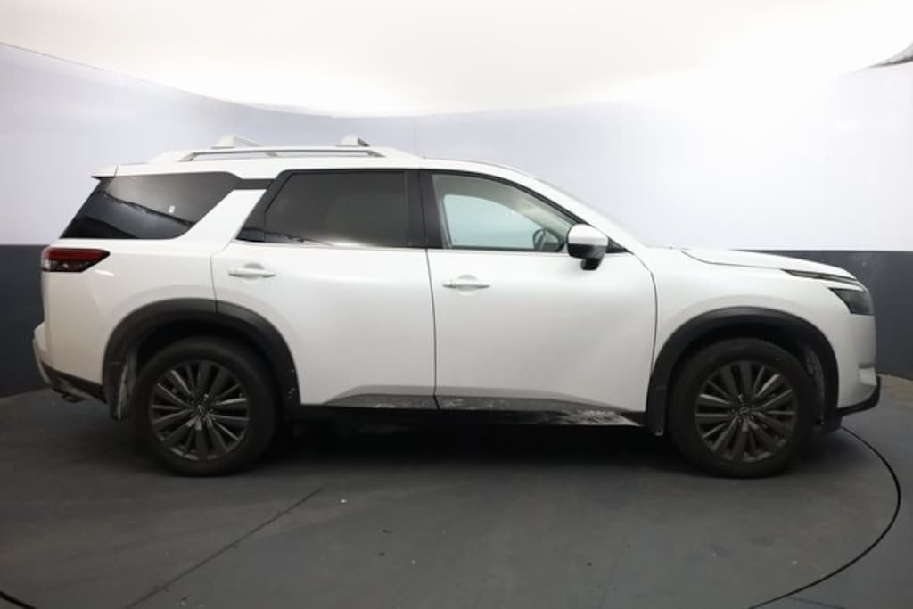 This Pathfinder is well equipped with SL Premium Package (20" Painted Alloy Wheels, 2nd-Row Captain Chairs, 2nd-Row Rear Headrest, Bose Premium Audio System, Heated Rear Seats, Panoramic Moonroof, and Tow Hitch Receiver & Harness), 4WD, 3rd row seats: bench, 4-Wheel Disc Brakes, 6 Speakers, ABS brakes, Air Conditioning, Alloy wheels, AM/FM radio: SiriusXM, Auto High-beam Headlights, Auto-dimming Rear-View mirror, Automatic temperature control, Black Splash Guards (Set of 4), Brake assist, Bumpers: body-color, Captain's Chairs Carpeted Floor Mats (Set of 4), Cross Bars, Delay-off headlights, Driver door bin, Driver vanity mirror, Dual front impact airbags, Dual front side impact airbags, Electronic Stability Control, Emergency communication system, Exterior Parking Camera Rear, Four wheel independent suspension, Front anti-roll bar, Front Bucket Seats, Front Center Armrest, Front dual zone A/C, Front reading lights, Fully automatic headlights, Garage door transmitter: HomeLink, Heated door mirrors, Heated Front Bucket Seats, Heated front seats, Heated steering wheel, Illuminated entry, Knee airbag, Leather steering wheel, Leather-Appointed Seating Surfaces, Low tire pressure warning, Navigation system: NissanConnect with Navigation and Services, Nissan Connect featuring Apple CarPlay and Android Auto, Nissan USB Charging Cable Set, NissanConnect w/Navigation & Services, Occupant sensing airbag, Outside temperature display, Overhead airbag, Overhead console, Panic alarm, Passenger door bin, Passenger vanity mirror, Power door mirrors, Power driver seat, Power Liftgate, Power passenger seat, Power steering, Power windows, Radio data system, Radio: AM/FM Audio System, Rear air conditioning, Rear anti-roll bar, Rear reading lights, Rear seat center armrest, Rear side impact airbag, Rear window defroster, Rear window wiper, Reclining 3rd row seat, Remote keyless entry, Security system, Speed control, Speed-sensing steering, Split folding rear seat, Spoiler, Steering wheel mounted audio controls, Tachometer, Telescoping steering wheel, Tilt steering wheel, Traction control, Trip computer, Turn signal indicator mirrors, Variably intermittent wipers, and Wheels: 18" x 8J Machined Alloy.