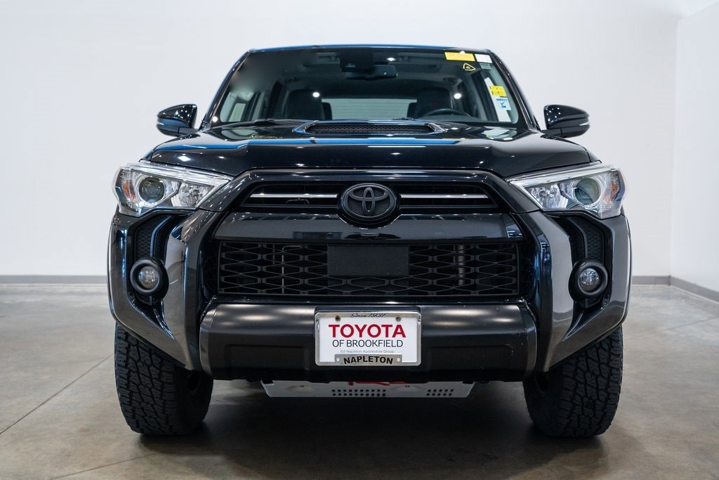 This 4Runner is well equipped with Overland Option (Black Roof Rails, Body Color Heated Mirrors, Garage Door Opener, and Wireless Smart Entry Door Lock), Venture Package (All Weather Floor Liners, Crossbars, Venture Cargo Tray, and Yakima Roof Cargo Basket), Toyota Gold Certified Certified, 4WD, Black/Graphite w/Softex Synthetic Leather Seat Trim, Moonroof w/Tilt Up & Slide, Trail Running Boards (TMS), 3.727 Axle Ratio, 4-Wheel Disc Brakes, 8 Speakers, ABS brakes, Air Conditioning, Alloy wheels, AM/FM radio: SiriusXM, Anti-whiplash front head restraints, Apple CarPlay/Android Auto, Auto High-beam Headlights, Auto-dimming Rear-View mirror, Brake assist, Bumpers: body-color, Compass, Driver door bin, Driver vanity mirror, Dual front impact airbags, Dual front side impact airbags, Electronic Stability Control, Emergency communication system: Safety Connect with 1-year trial, Exterior Parking Camera Rear, Front anti-roll bar, Front Bucket Seats, Front Center Armrest, Front fog lights, Front reading lights, Front wheel independent suspension, Garage door transmitter: HomeLink, Heated door mirrors, Heated front seats, High Performance LED Fog Lights (TMS), Illuminated entry, Knee airbag, Leather Shift Knob, Leather steering wheel, Low tire pressure warning, Navigation System, Occupant sensing airbag, Outside temperature display, Overhead airbag, Overhead console, Panic alarm, Passenger door bin, Passenger vanity mirror, Power door mirrors, Power driver seat, Power passenger seat, Power steering, Power windows, Radio: Premium Audio w/Dynamic Navigation, Rear anti-roll bar, Rear seat center armrest, Rear window defroster, Rear window wiper, Remote keyless entry, Roof rack, Security system, Softex Synthetic Leather Seat Trim, Speed control, Speed-sensing steering, Split folding rear seat, Spoiler, Steering wheel mounted audio controls, Tachometer, Telescoping steering wheel, Tilt steering wheel, Traction control, Trip computer, Turn signal indicator mirrors, Variably intermittent wipers, and Wheels: 17 Matte Black Flow-Formed TRD Alloy.
