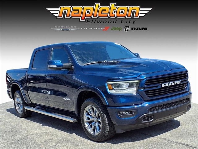 Engine: 5.7L V-8 cyl, Transmission: 8-Speed Automatic, Exterior Color: Patriot Blue Pearlcoat, Interior Color: Black,Stock #: MN771218P, Mileage: 75,527 miles miles, Bodystyle: Truck Crew Cab, Drive Line: 4x4, Location: Napleton's Ellwood Chrysler Dodge Jeep Ram, Comments: Patriot Blue Pearlcoat 2021 Ram 1500 4D Crew Cab Laramie HEMI 5.7L V8 Multi Displacement VVT 4WD
