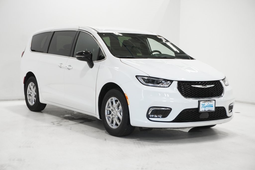 This Pacifica is well equipped with Quick Order Package 27L, Safety Sphere (360 Surround View Camera System and ParkSense Front/Rear Park Assist w/Stop), 10.1" Touchscreen Display, 17" x 7.0" Aluminum Wheels, 3.25 Axle Ratio, 3rd row seats: split-bench, 4-Wheel Disc Brakes, 4G LTE Wi-Fi Hot Spot, 6 Speakers, ABS brakes, Air Conditioning, Alloy wheels, AM/FM radio: SiriusXM, Apple CarPlay, Apple CarPlay/Android Auto, Auto-dimming Rear-View mirror, Automatic temperature control, Black Seats, Brake assist, Bumpers: body-color, Caprice Leatherette Bucket Seats, Compass, Connectivity - US/Canada, Delay-off headlights, Disassociated Touchscreen Display, Driver door bin, Driver vanity mirror, Driver's Seat Mounted Armrest, Dual front impact airbags, Dual front side impact airbags, Electronic Stability Control, Emergency communication system: Chrysler Connect, For Details, Visit DriveUconnect.com, Four wheel independent suspension, Front anti-roll bar, Front Bucket Seats, Front dual zone A/C, Front fog lights, Front reading lights, Fully automatic headlights, Garage door transmitter, Google Android Auto, GPS Antenna Input, Heated door mirrors, Heated front seats, Heated steering wheel, Illuminated entry, Integrated Active Noise Cancellation, Integrated Center Stack Radio, Knee airbag, Low tire pressure warning, Memory seat, Occupant sensing airbag, Outside temperature display, Overhead airbag, Overhead console, Panic alarm, ParkView Rear Back-Up Camera, Passenger door bin, Passenger seat mounted armrest, Passenger vanity mirror, Power door mirrors, Power driver seat, Power Liftgate, Power steering, Power windows, Radio data system, Radio: Uconnect 5 w/10.1" Display, Rain sensing wipers, Rear air conditioning, Rear reading lights, Rear window defroster, Rear window wiper, Reclining 3rd row seat, Remote keyless entry, Security system, Speed control, Split folding rear seat, Spoiler, Steering wheel mounted audio controls, Tachometer, Telescoping steering wheel, Tilt steering wheel, Touring Suspension, Traction control, Trip computer, Turn signal indicator mirrors, USB Host Flip, Variably intermittent wipers, and Voltmeter.