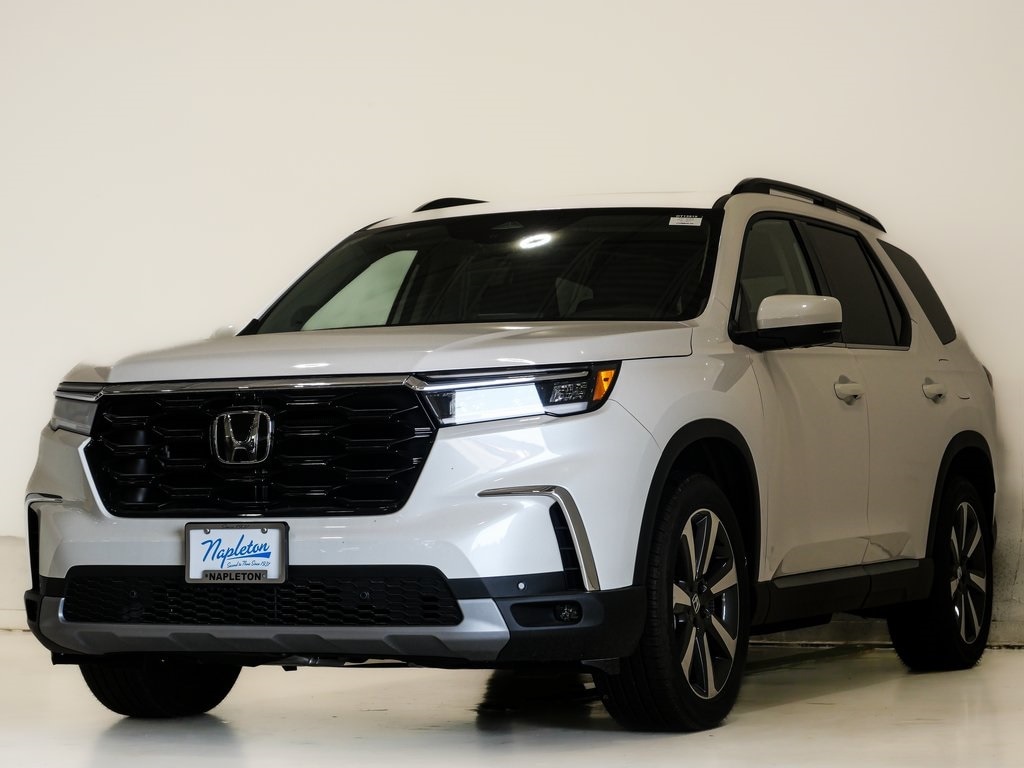 2025 Honda Pilot Elite 12 Speakers, 3rd row seats: split-bench, 4-Wheel Disc Brakes, 4.167 Axle Ratio, ABS brakes, Adaptive Cruise Control: Adaptive Cruise Control (ACC) with Low-Speed Follow, Air Conditioning, Alloy wheels, AM/FM radio: SiriusXM, Apple CarPlay/Android Auto, Auto High-beam Headlights, Auto-dimming door mirrors, Auto-dimming Rear-View mirror, Automatic temperature control, Blind Spot Information (BSI) System warning, Bose Premium Sound System, Brake assist, Bumpers: body-color, Compass, Delay-off headlights, Driver door bin, Driver vanity mirror, Dual front impact airbags, Dual front side impact airbags, Electronic Stability Control, Emergency communication system: HondaLink, Exterior Parking Camera Rear, Four wheel independent suspension, Front anti-roll bar, Front Bucket Seats, Front Center Armrest, Front dual zone A/C, Front fog lights, Front reading lights, Fully automatic headlights, Garage door transmitter: HomeLink, Heads-Up Display, Heated & Ventilated Front Bucket Seats, Heated door mirrors, Heated front seats, Heated rear seats, Heated steering wheel, Honda Satellite-Linked Navigation System, HondaLink Subscription Services, Illuminated entry, Knee airbag, Lane departure: Lane Keeping Assist System (LKAS) active, Low tire pressure warning, Memory seat, Navigation system: Honda Satellite-Linked Navigation System, Occupant sensing airbag, Outside temperature display, Overhead airbag, Overhead console, Panic alarm, Passenger door bin, Passenger vanity mirror, Perforated Leather Seat Trim, Power door mirrors, Power driver seat, Power Liftgate, Power moonroof, Power passenger seat, Power steering, Power windows, Radio data system, Rain sensing wipers, Rear air conditioning, Rear anti-roll bar, Rear reading lights, Rear seat center armrest, Rear window defroster, Rear window wiper, Reclining 3rd row seat, Remote keyless entry, Security system, SiriusXM, Speed control, Speed-sensing steering, Speed-Sensitive Wipers, Split folding rear seat, Spoiler, Steering wheel mounted audio controls, Tachometer, Telescoping steering wheel, Tilt steering wheel, Traction control, Trip computer, Turn signal indicator mirrors, Variably intermittent wipers, Ventilated front seats, Wheels: 20" Shark Gray Machine Face w/Blk Lug Nuts.