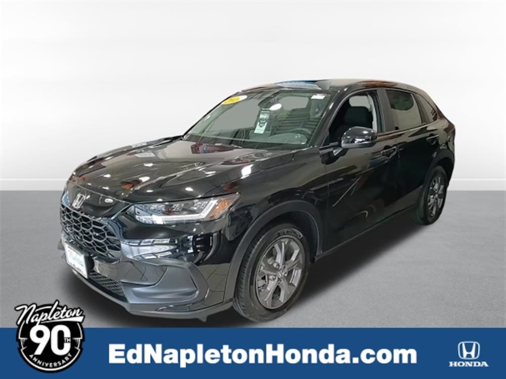 This HR-V is well equipped with 4 Speakers, 4-Wheel Disc Brakes, ABS brakes, Adaptive Cruise Control: Adaptive Cruise Control (ACC) with Low-Speed Follow, Air Conditioning, Alloy wheels, AM/FM radio, Apple CarPlay/Android Auto, Auto High-beam Headlights, Automatic temperature control, Brake assist, Bumpers: body-color, Cloth Seat Trim, Compass, Delay-off headlights, Driver door bin, Driver vanity mirror, Dual front impact airbags, Dual front side impact airbags, Electronic Stability Control, Exterior Parking Camera Rear, Four wheel independent suspension, Front anti-roll bar, Front Bucket Seats, Front Center Armrest, Front reading lights, Fully automatic headlights, Illuminated entry, Knee airbag, Low tire pressure warning, Occupant sensing airbag, Outside temperature display, Overhead airbag, Panic alarm, Passenger door bin, Passenger vanity mirror, Power door mirrors, Power steering, Power windows, Radio data system, Radio: 180-Watt Audio System w/4 Speakers, Rear anti-roll bar, Rear reading lights, Rear side impact airbag, Rear window defroster, Rear window wiper, Remote keyless entry, Security system, Speed control, Speed-sensing steering, Split folding rear seat, Spoiler, Steering wheel mounted audio controls, Tachometer, Telescoping steering wheel, Tilt steering wheel, Traction control, Trip computer, Variably intermittent wipers, and Wheels: 17" Pewter Gray Alloy.