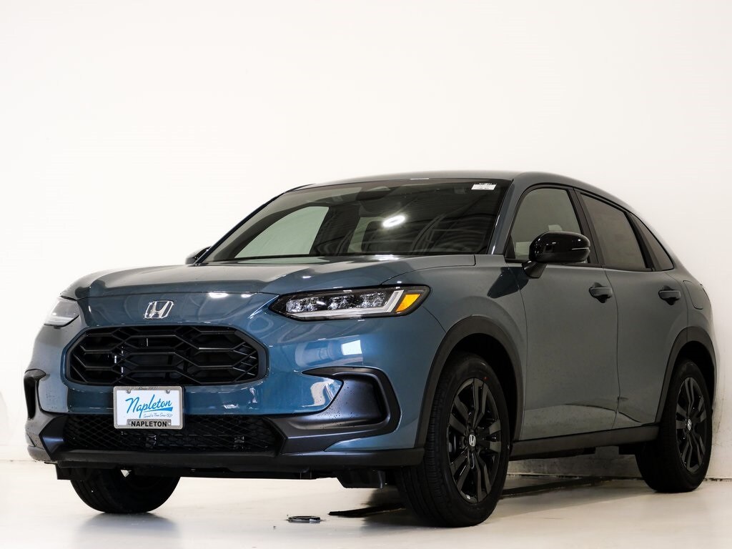 2026 Honda HR-V Sport 4-Wheel Disc Brakes, 6 Speakers, ABS brakes, Adaptive Cruise Control: Adaptive Cruise Control (ACC) with Low-Speed Follow, Air Conditioning, Alloy wheels, AM/FM radio, Apple CarPlay/Android Auto, Auto High-beam Headlights, Automatic temperature control, Blind Spot Information (BSI) System warning, Brake assist, Bumpers: body-color, Cloth Seat Trim, Compass, Delay-off headlights, Driver door bin, Driver vanity mirror, Dual front impact airbags, Dual front side impact airbags, Electronic Stability Control, Exterior Parking Camera Rear, Four wheel independent suspension, Front anti-roll bar, Front Bucket Seats, Front Center Armrest, Front reading lights, Fully automatic headlights, Heated door mirrors, Heated Front Bucket Seats, Heated front seats, Illuminated entry, Knee airbag, Low tire pressure warning, Occupant sensing airbag, Outside temperature display, Overhead airbag, Panic alarm, Passenger door bin, Passenger vanity mirror, Power door mirrors, Power steering, Power windows, Radio data system, Radio: 180-Watt Audio System w/6 Speakers, Rear anti-roll bar, Rear reading lights, Rear side impact airbag, Rear window defroster, Rear window wiper, Remote keyless entry, Security system, Speed control, Speed-sensing steering, Split folding rear seat, Spoiler, Steering wheel mounted audio controls, Tachometer, Telescoping steering wheel, Tilt steering wheel, Traction control, Trip computer, Turn signal indicator mirrors, Variably intermittent wipers, Wheels: 18" Gloss Black Alloy. 25/30 City/Highway MPG