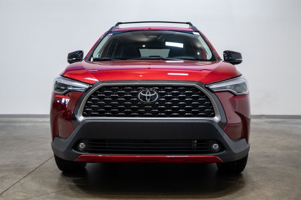 This Corolla Cross is well equipped with Convenience Package (PBD Auto & Easy Closer Door and Tilt & Slide Moonroof), 4-Wheel Disc Brakes, 6 Speakers, ABS brakes, Activity Mount (TMS), Adaptive Headlights, Air Conditioning, All Weather Floor/Cargo Liner (TMS), Alloy wheels, AM/FM radio: SiriusXM, Auto High-beam Headlights, Auto-dimming Rear-View mirror, Automatic temperature control, Brake assist, Bumpers: body-color, Cargo Tote (TMS), Cross Bars (TMS), Delay-off headlights, Door Edge Guard (TMS), Driver door bin, Driver vanity mirror, Dual front impact airbags, Dual front side impact airbags, Electronic Stability Control, Emergency communication system: Safety Connect (10-year trial), Exterior Parking Camera Rear, First Aid Kit (TMS), Four wheel independent suspension, Front anti-roll bar, Front Bucket Seats, Front Center Armrest, Front dual zone A/C, Front fog lights, Front reading lights, Fully automatic headlights, Garage door transmitter: HomeLink, Heated door mirrors, Heated Front Bucket Seats, Heated front seats, Illuminated entry, IMB & Alarm Anti-Theft System, Key Gloves (TMS), Knee airbag, Leather Shift Knob, Leather steering wheel, Low tire pressure warning, Mudguards (TMS), Occupant sensing airbag, Outside temperature display, Overhead airbag, Panic alarm, Passenger door bin, Passenger vanity mirror, Power door mirrors, Power driver seat, Power steering, Power windows, Radio data system, Radio: 8 Toyota Audio Multimedia w/6 Speakers, Radio: JBL Premium Audio w/9 Speakers, Rear anti-roll bar, Rear Bumper Protector (TMS), Rear seat center armrest, Rear side impact airbag, Rear window defroster, Rear window wiper, Remote keyless entry, Softex Synthetic Leather Seat Trim, Speed control, Split folding rear seat, Spoiler, Steering wheel mounted audio controls, Tachometer, Telescoping steering wheel, Tilt steering wheel, Traction