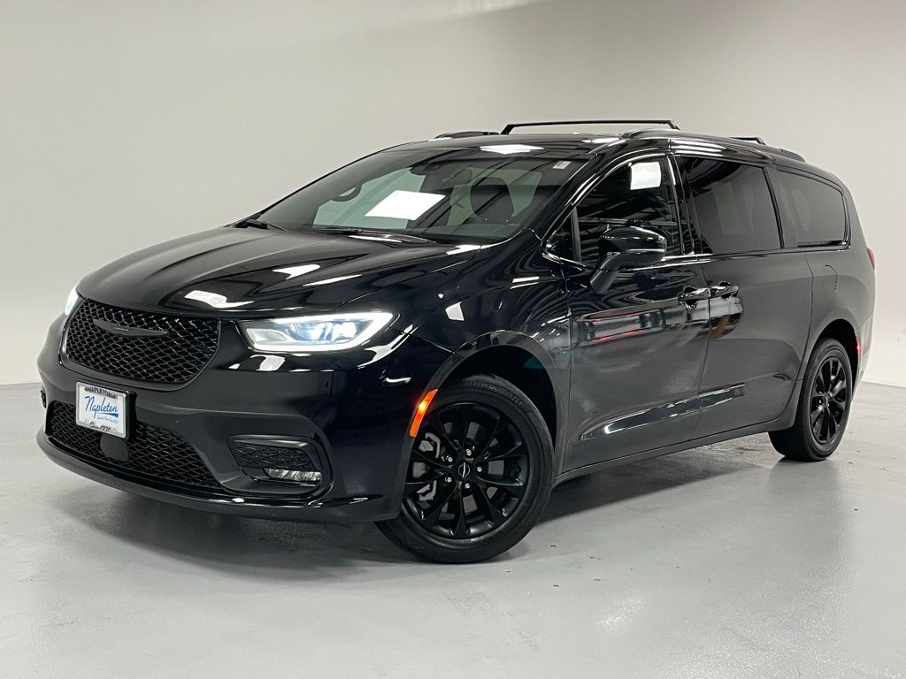 This Pacifica is well equipped with Quick Order Package 27L, S Appearance Package (Anodized Ice Cave Accents, Anodized Ink Badging, Black Day Light Opening Moldings, Black Stow N Place Roof Rack, Body Color Door Handles, Perforated Leather Bucket Seats w/S Logo, Piano Black Interior Accents, Premium Fascia Upper/Lower Grille w/Black Surround, Premium Rear Fascia Black, S Badge, and Wheels: 18" x 7.5" S-Model Aluminum Design 2), 10.1" Touchscreen Display, 3.73 Axle Ratio, 3rd row seats: split-bench, 4-Wheel Disc Brakes, 6 Speakers, ABS brakes, Air Conditioning, Alloy wheels, AM/FM radio: SiriusXM, Apple CarPlay, Apple CarPlay/Android Auto, Auto-dimming Rear-View mirror, Automatic temperature control, AWD Suspension, Black Seats, Brake assist, Bumpers: body-color, Compass, Delay-off headlights, Disassociated Touchscreen Display, Driver door bin, Driver vanity mirror, Driver's Seat Mounted Armrest, Dual front impact airbags, Dual front side impact airbags, Electronic Stability Control, Four wheel independent suspension, Front anti-roll bar, Front Bucket Seats, Front dual zone A/C, Front Fascia Air Deflectors, Front fog lights, Front reading lights, Fully automatic headlights, Garage door transmitter: HomeLink, Google Android Auto, GPS Antenna Input, Heated door mirrors, Heated front seats, Heated steering wheel, Illuminated entry, Instrument Panel Anodized Silver Bezel, Integrated Center Stack Radio, Knee airbag, Leather steering wheel, Low tire pressure warning, Memory seat, Occupant sens