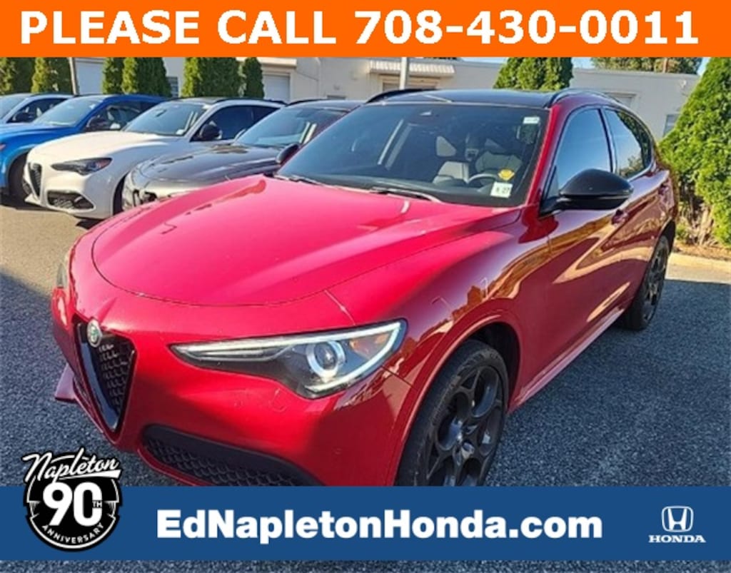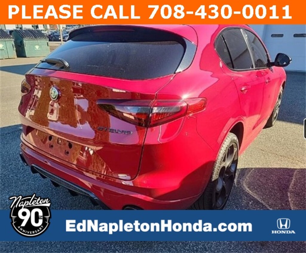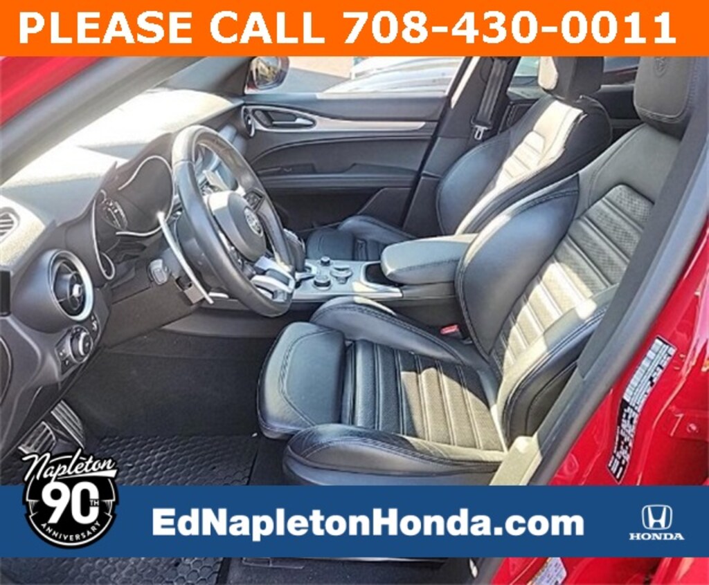 This Stelvio is well equipped with Quick Order Package 22S Veloce (115V Auxiliary Power Outlet, Aluminum Interior Trim, Aluminum Steering Column Mounted Paddle Shifters, Body Color Appearance Kit, Dark Miron V Scudetto Grille, Gloss Black Window Surround Moldings, Gloss Red Calipers w/White Script, Limited Slip Differential Rear Axle, Power 8-Way Adjustable Driver Seat, Power Adjust 8-Way Front Passenger Seat, Power Adjustable Bolster, Sport Leather Seats, Sport Rear Diffuser, and Wheels: 20" x 8.5" Sport 5-Hole Aluminum), 3.73 Axle Ratio, 4-Wheel Disc Brakes, 8 Speakers, ABS brakes, Air Conditioning, Alloy wheels, AM/FM radio: SiriusXM, Apple CarPlay/Android Auto, Auto High-beam Headlights, Auto-dimming door mirrors, Auto-dimming Rear-View mirror, Automatic temperature control, Brake assist, Bumpers: body-color, Compass, Delay-off headlights, Driver door bin, Driver vanity mirror, Dual front impact airbags, Dual front side impact airbags, Electronic Stability Control, Emergency communication system: SiriusXM Guardian - included trial, Four wheel independent suspension, Front anti-roll bar, Front Bucket Seats, Front Center Armrest, Front dual zone A/C, Front reading lights, Fully automatic headlights, Garage door transmitter, Genuine wood console insert, Genuine wood dashboard insert, Genuine wood door panel insert, Headlight cleaning, Heated door mirrors, Heated front seats, Heated rear seats, Heated steering wheel, High intensity discharge headlights: Bi-Xenon, Illuminated entry, Knee airbag, Leather Seats, Leather Shift Knob, Leather steering wheel, Low tire pressure warning, Memory seat, Navigation System, Occupant sensing airbag, Outside temperature display, Overhead airbag, Overhead console, Panic alarm, ParkView Rear Back-Up Camera, Passenger door bin, Passenger vanity mirror, Power door mirrors, Power driver seat, Power Liftgate, Power moonroof, Power passenger seat, Power steering, Power windows, Radio data system, Radio: AM/FM/HD 8.8" w/Navigation, Rain sensing wipers, Rear anti-roll bar, Rear audio controls, Rear fog lights, Rear reading lights, Rear seat center armrest, Rear window defroster, Rear window wiper, Remote keyless entry, Security system, Speed control, Speed-sensing steering, Speed-Sensitive Wipers, Split folding rear seat, Spoiler, Sport steering wheel, Steering wheel mounted audio controls, Tachometer, Telescoping steering wheel, Tilt steering wheel, Traction control, Trip computer, Turn signal indicator mirrors, Variably intermittent wipers, Wheels: 19" x 8.0" Sport 5-Hole Aluminum, and Wheels: 21" x 8.5" Dark 5-Hole Aluminum.
