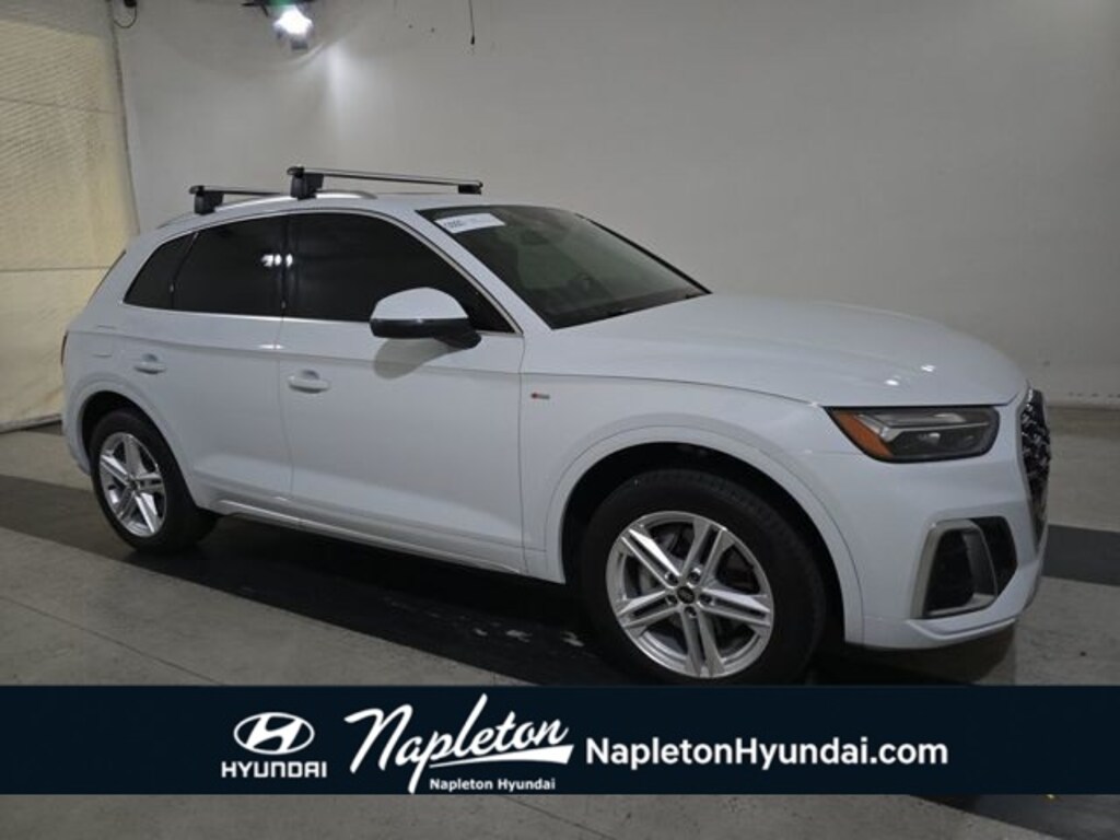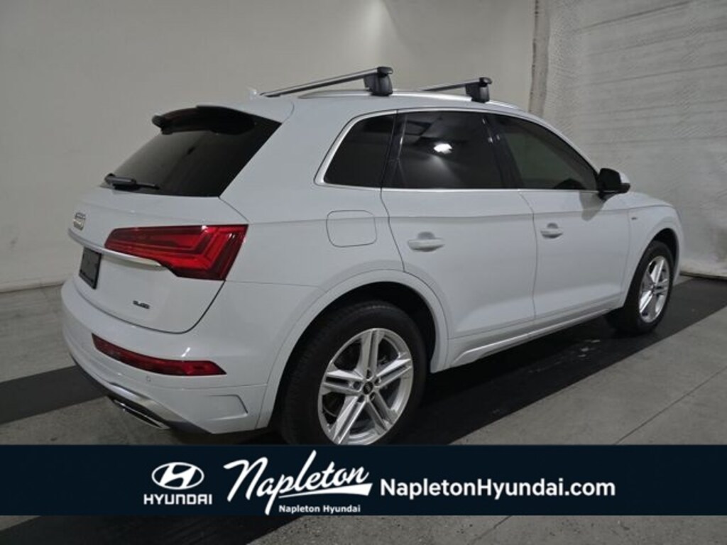 This Q5 e is well equipped with Convenience Package (Audi Advanced Key, Auto-Dimming Heated & Pwr Folding Exterior Mirrors, Driver Seat Memory, Heated Steering Wheel, and SiriusXM All Access Service), Premium Plus Package (Adaptive Cruise Control w/Traffic Jam Assist, Audi Active Lane Assist, Audi Phone Box, Deluxe Pre-Entry Climate Control, Hands-On Detection Steering Wheel, Panoramic Sunroof, Power Adjustable Steering Column, and Top View Camera System), Warm Weather Package (Manual Rear Side Window Shades and Ventilated Front Seats), 10 Speakers, 4-Wheel Disc Brakes, ABS brakes, Air Conditioning, Alloy wheels, AM/FM radio, Audi Beam-Rings, Audi Guard Wheel Lock Kit, Audi Phone Box Delete, Audi smartphone interface (Apple CarPlay/Android Auto), Auto High-beam Headlights, Auto-dimming Rear-View mirror, Automatic temperature control, Axle Ratio: 5.30, Brake assist, Bumpers: body-color, Compass, Delay-off headlights, Driver door bin, Driver vanity mirror, Dual front impact airbags, Dual front side impact airbags, Electronic Stability Control, Emergency communication system: Audi connect CARE, Exterior Parking Camera Rear, Four wheel independent suspension, Front anti-roll bar, Front Bucket Seats, Front Center Armrest, Front dual zone A/C, Front fog lights, Front reading lights, Garage door transmitter: HomeLink, Genuine wood console insert, Genuine wood dashboard insert, Genuine wood door panel insert, Gray-Brown Birch Natural Wood Inlays, Heated 8-Way Power Front Seats, Heated door mirrors, Heated front seats, Illuminated entry, Leather Seating Surfaces, Leather Shift Knob, Low tire pressure warning, Occupant sensing airbag, Outside temperature display, Overhead airbag, Overhead console, Panic alarm, Passenger door bin, Passenger vanity mirror, Power door mirrors, Power driver seat, Power Liftgate, Power passenger seat, Power steering, Power windows, Privacy Trunk Cover, Radio data system, Radio: Audi Sound System, Rain sensing wipers, Rear air conditioning, Rear anti-roll bar, Rear fog lights, Rear reading lights, Rear seat center armrest, Rear window defroster, Rear window wiper, Remote keyless entry, Roof rack, Security system, Speed control, Speed-sensing steering, Speed-Sensitive Wipers, Split folding rear seat, Spoiler, Sport steering wheel, Steering wheel mounted audio controls, Tachometer, Telescoping steering wheel, Tilt steering wheel, Traction control, Trip computer, Turn signal indicator mirrors, Variably intermittent wipers, and Wheels: 19" 5-Double-Spoke-Star Design.