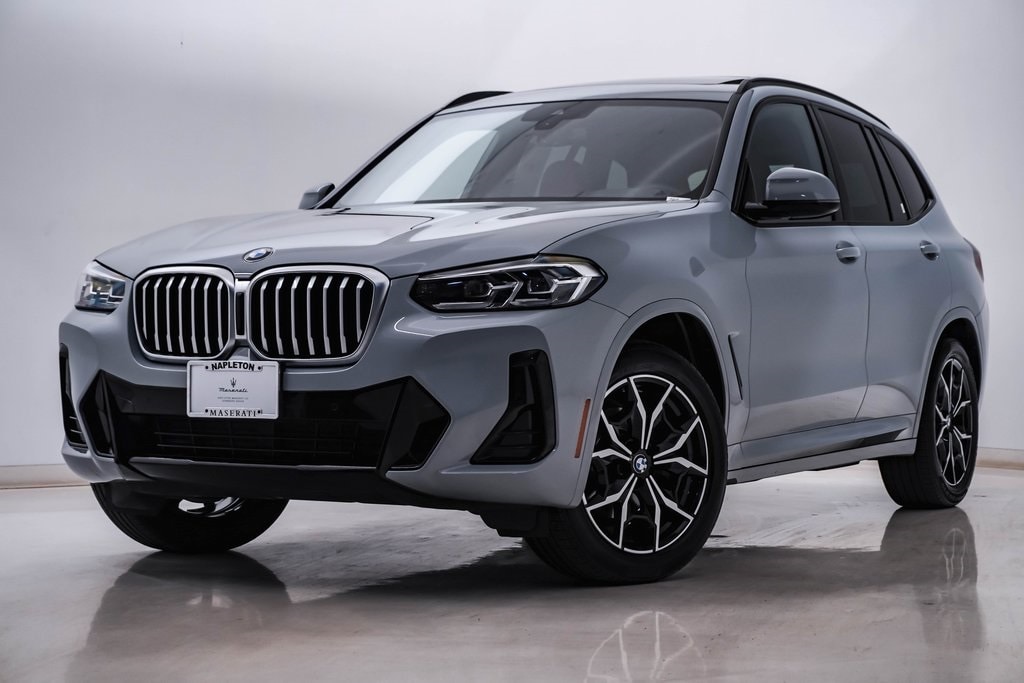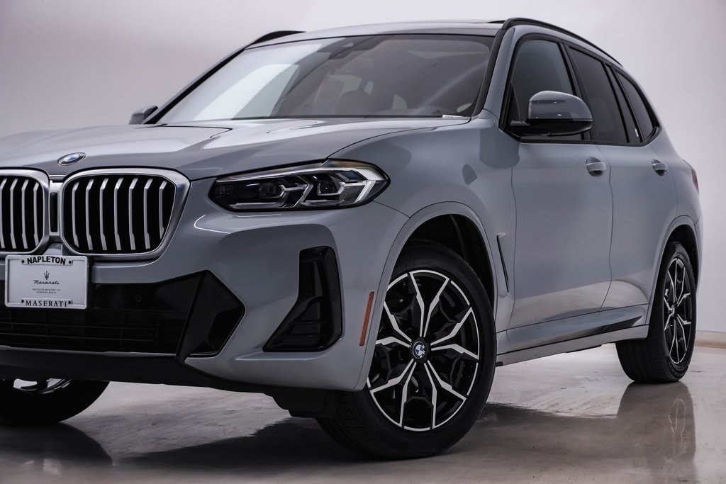 This X3 is well equipped with Convenience Package w/ZPA (Lumbar Support and Panoramic Moonroof (ZPA)), M Sport Package (Aerodynamic Kit, M Steering Wheel, Roof Rails in High-Gloss Shadowline, Shadowline Exterior Trim, Smoke Grey Aluminum Rhombicle Trim, Wheels: 19" x 7.5" M Y-Spoke Bi-Color (Style 887M), and Without Exterior Lines Designation), M Sport Package (337), Connected Package Pro, 8-Speed Automatic Sport, 12 Speakers, 3.385 Axle Ratio, 4-Wheel Disc Brakes, ABS brakes, Air Conditioning, Alloy wheels, AM/FM Radio, AM/FM radio: SiriusXM with 360L, Apple CarPlay & Android Auto Compatibility, Auto High-beam Headlights, Auto-dimming door mirrors, Auto-dimming Rear-View mirror, Automatic temperature control, BMW Assist eCall, BMW TeleServices, Brake assist, Bumpers: body-color, Comfort Access Keyless Entry, ConnectedDrive Services, Delay-off headlights, Driver door bin, Driver vanity mirror, Dual front impact airbags, Dual front side impact airbags, Electronic Stability Control, Emergency communication system: BMW Assist eCall, Enhanced Bluetooth, Exterior Parking Camera Rear, Four wheel independent suspension, Front anti-roll bar, Front Bucket Seats, Front Center Armrest, Front dual zone A/C, Front reading lights, Fully automatic headlights, Garage door transmitter, Genuine wood dashboard insert, Genuine wood door panel insert, Heated door mirrors, Heated Front Seats, Heated Steering Wheel, Hi-Fi Sound System, Illuminated entry, Knee airbag, Low tire pressure warning, Memory seat, Navigation, Navigation System, Occupant sensing airbag, Outside temperature display, Overhead airbag, Panic alarm, Passenger door bin, Passenger vanity mirror, Perforated SensaTec Upholstery, Power door mirrors, Power driver seat, Power Front Seats, Power Liftgate, Power passenger seat, Power steering, Power windows, Radio data system, Rain sensing wipers, Rear air conditioning, Rear anti-roll bar, Rear reading lights, Rear seat center armrest, Rear window defroster, Rear window wiper, Remote Engine Start, Remote keyless entry, Roof rack: rails only, Security system, SiriusXM w/360L, Speed control, Speed-sensing steering, Speed-Sensitive Wipers, Split folding rear seat, Spoiler, Sport Seats, Sport steering wheel, Steering wheel mounted audio controls, Tachometer, Telescoping steering wheel, Tilt steering wheel, Traction control, Trip computer, Turn signal indicator mirrors, Variably intermittent wipers, Wheels: 19" x 7.5" Y-Spoke (Style 693), and WiFi Hotspot.