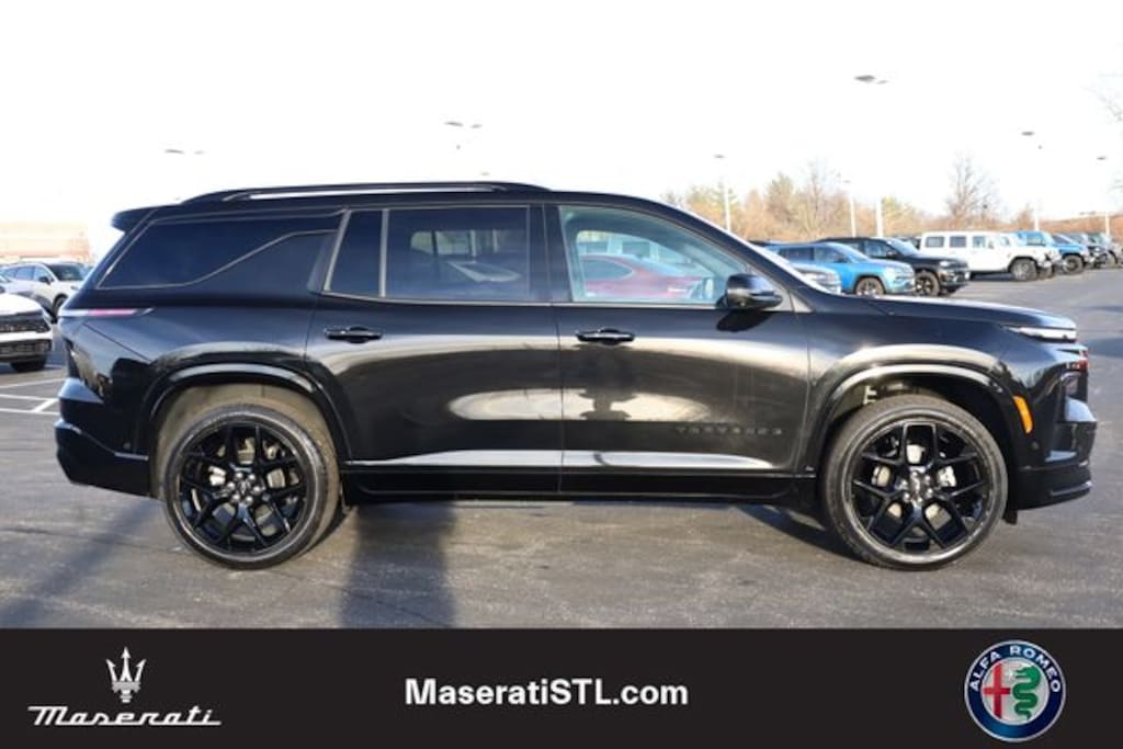 This Traverse is well equipped with Preferred Equipment Group 1RS, 10 Speakers, 3rd row seats: split-bench, 4-Wheel Disc Brakes, 6-Way Power Front Passenger Seat Adjuster, 8-Way Power Driver Seat Adjuster, ABS brakes, Air Conditioning, Alloy wheels, AM/FM radio: SiriusXM with 360L, Apple CarPlay/Android Auto, Auto High-beam Headlights, Auto-dimming door mirrors, Automatic temperature control, Bose Premium 10-Speaker Audio System Feature, Brake assist, Bumpers: body-color, Compass, Delay-off headlights, Driver 4-Way Power Lumbar Seat Adjuster, Driver door bin, Driver vanity mirror, Dual front impact airbags, Dual front side impact airbags, Electronic Stability Control, Emergency communication system, Exterior Parking Camera Rear, Four wheel independent suspension, Front anti-roll bar, Front Bucket Seats, Front Center Armrest, Front dual zone A/C, Front Passenger 4-Way Power Lumbar Seat Adjuster, Front reading lights, Fully automatic headlights, Heated door mirrors, Heated front seats, Heated rear seats, Heated steering wheel, Illuminated entry, Low tire pressure warning, Navigation System, Not Equipped w/Heated Wiper Park, Occupant sensing airbag, Outside temperature display, Overhead airbag, Overhead console, Panic alarm, Passenger door bin, Passenger vanity mirror, Perforated Leather-Appointed Seat Trim, Power door mirrors, Power driver seat, Power Liftgate, Power moonroof, Power passenger seat, Power steering, Power windows, Radio data system, Radio: 17.7" Diagonal Display, Rain sensing wipers, Rear air conditioning, Rear anti-roll bar, Rear reading lights, Rear window defroster, Rear window wiper, Remote keyless entry, Security system, SiriusXM w/360L, Speed control, Speed-sensing steering, Spoiler, Sport steering wheel, Steering wheel mounted audio controls, Tachometer, TBD Axle Ratio, Telescoping steering wheel, Tilt steering wheel, Traction control, Trip computer, Turn signal indicator mirrors, Variably intermittent wipers, Ventilated front seats, Voltmeter, and Wheels: 22" High Gloss Black Painted Aluminum.