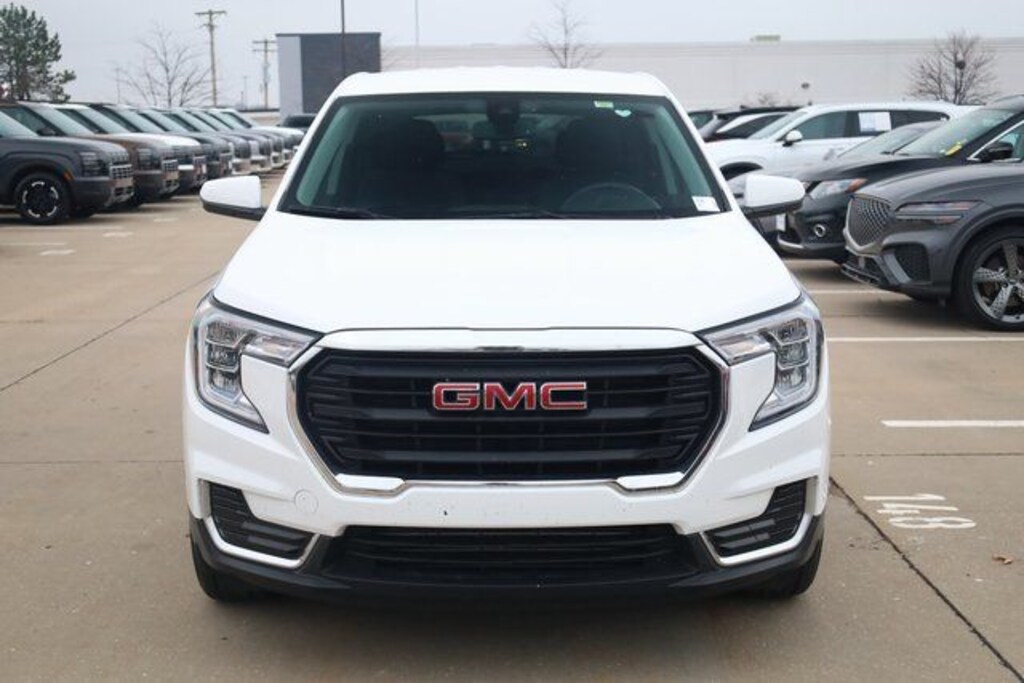 This Terrain is well equipped with Preferred Equipment Group 3SA, 2 USB Data Ports w/Auxiliary Input Jack, 3.47 Final Drive Axle Ratio, 4-Way Manual Driver's Seat, 4-Way Manual Front Passenger Seat, 4-Wheel Disc Brakes, 4.2" Multi-Color Driver Information Screen, 6 Speakers, 6-Speaker Audio System Feature, ABS brakes, Air Conditioning, Alloy wheels, AM/FM radio: SiriusXM, Auto High-beam Headlights, Auto-dimming Rear-View mirror, Automatic temperature control, Bluetooth® For Phone, Brake assist, Bumpers: body-color, Compass, Delay-off headlights, Driver door bin, Driver vanity mirror, Dual front impact airbags, Dual front side impact airbags, Electronic Stability Control, Emergency communication system: OnStar and GMC connected services capable, Four wheel independent suspension, Front anti-roll bar, Front Bucket Seats, Front Center Armrest, Front reading lights, Fully automatic headlights, Heated door mirrors, Illuminated entry, Low tire pressure warning, Occupant sensing airbag, Outside temperature display, Overhead airbag, Overhead console, Panic alarm, Passenger door bin, Passenger vanity mirror, Power door mirrors, Power steering, Power windows, Premium Cloth Seat Trim, Radio data system, Radio: GMC Infotainment Audio System w/7" Display, Rear anti-roll bar, Rear seat center armrest, Rear window defroster, Rear window wiper, Remote keyless entry, Security system, SiriusXM, Speed control, Speed-sensing steering, Split folding rear seat, Spoiler, Steering wheel mounted audio controls, Tachometer, Telescoping steering wheel, Tilt steering wheel, Traction control, Trip computer, Variably intermittent wipers, Wheels: 17" x 7" Silver Painted Aluminum, and Wireless Apple CarPlay/Wireless Android Auto.