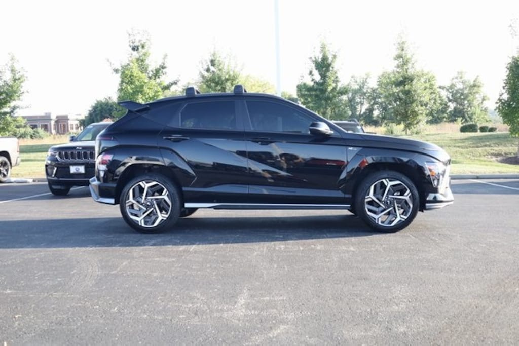 This Kona is well equipped with Option Group 01, 4-Wheel Disc Brakes, 6 Speakers, ABS brakes, Air Conditioning, Alloy wheels, AM/FM radio: SiriusXM, Apple CarPlay & Android Auto, Auto High-beam Headlights, Automatic temperature control, Brake assist, Bumpers: body-color, Cargo Net, Cargo Tray, Carpeted Floor Mats, Column-Mounted Shift-By-Wire, Cross Rails, Delay-off headlights, Driver door bin, Driver vanity mirror, Dual front impact airbags, Dual front side impact airbags, Electronic Stability Control, Emergency communication system: Bluelink+, Exterior Parking Camera Rear, First Aid Kit, Four wheel independent suspension, Front anti-roll bar, Front Bucket Seats, Front Center Armrest, Front dual zone A/C, Front reading lights, Fully automatic headlights, Heated door mirrors, Heated front seats, Heated Front Sport Bucket Seats, Illuminated entry, Leather steering wheel, Low tire pressure warning, N-Line Alcantara Sport Combination Seat Trim, Occupant sensing airbag, Outside temperature display, Overhead airbag, Panic alarm, Passenger door bin, Passenger vanity mirror, Power door mirrors, Power driver seat, Power steering, Power windows, Radio: AM/FM/HD Radio/SiriusXM Audio System, Rear anti-roll bar, Rear seat center armrest, Rear window defroster, Rear window wiper, Remote keyless entry, Security system, Speed control, Speed-sensing steering, Split folding rear seat, Spoiler, Steering wheel mounted audio controls, Tachometer, Telescoping steering wheel, Tilt steering wheel, Traction control, Trip computer, Turn signal indicator mirrors, Variably intermittent wipers, and Wheels: 19" x 7.5J Metallic Alloy.