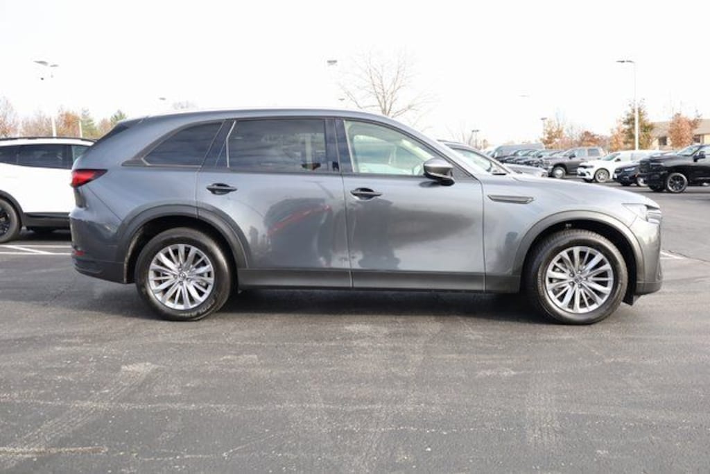 This Mazda CX-90 is well equipped with 2nd-Row Captain's Chairs, 3.692 Axle Ratio, 3rd row seats: bench, 4-Wheel Disc Brakes, 8 Speakers, ABS brakes, Air Conditioning, Alloy wheels, AM/FM radio, AppLink/Apple CarPlay and Android Auto, Auto High-beam Headlights, Automatic temperature control, Brake assist, Bumpers: body-color, Compass, Delay-off headlights, Driver door bin, Driver vanity mirror, Dual front impact airbags, Dual front side impact airbags, E911 Automatic Emergency Notification, Electronic Stability Control, Emergency communication system: MAZDA CONNECT, Exterior Parking Camera Rear, Four wheel independent suspension, Front anti-roll bar, Front Bucket Seats, Front Center Armrest w/Storage, Front dual zone A/C, Front reading lights, Fully automatic headlights, Heated door mirrors, Heated Front Bucket Seats, Heated front seats, Illuminated entry, Infotainment System Voice Command, Knee airbag, Leather Seat Trim, Leather Shift Knob, Leather steering wheel, Low tire pressure warning, Machine Gray Metallic Paint Charge, Mazda Connected Services, Occupant sensing airbag, Outside temperature display, Overhead airbag, Overhead console, Pandora Internet Radio Integration, Panic alarm, Passenger door bin, Passenger vanity mirror, Power door mirrors, Power driver seat, Power Liftgate, Power moonroof, Power passenger seat, Power steering, Power windows, Radio Broadcast Data System Program Information, Radio data system, Radio: AM/FM Sound System, Rain sensing wipers, Rear air conditioning, Rear anti-roll bar, Rear reading lights, Rear seat center armrest, Rear window defroster, Rear window wiper, Remote keyless entry, SMS Text Msg Audio Delivery & Reply, Speed control, Speed-sensing steering, Split folding rear seat, Spoiler, Steering wheel mounted audio controls, Tachometer, Telescoping steering wheel, Tilt steering wheel, Traction control, Trip computer, Turn signal indicator mirrors, Variably intermittent wipers, and Wheels: 19" x 8.5J Aluminum Alloy.